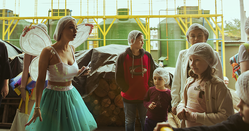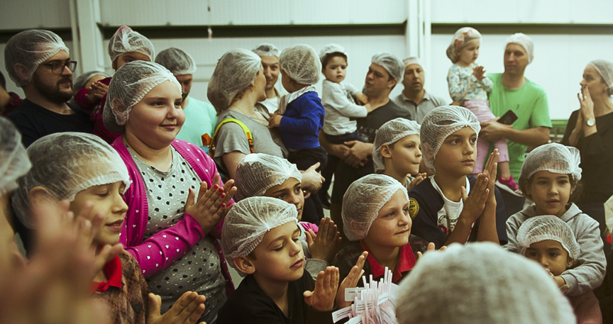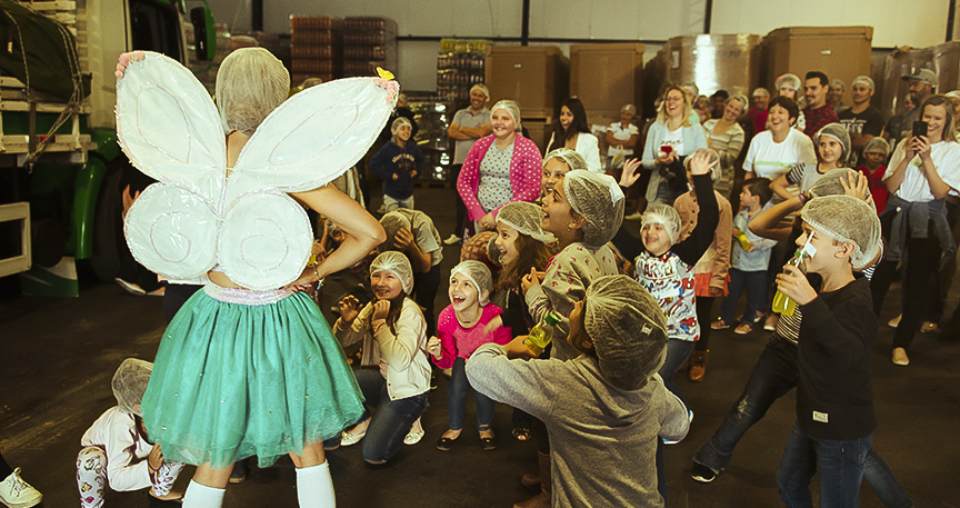 Com a ajuda da Fada Cristal, as cinquenta e duas crianças que visitaram a fábrica foram guiadas pelos setores Administrativo e Produção, lugar onde a magia das Laranjinhas acontece.