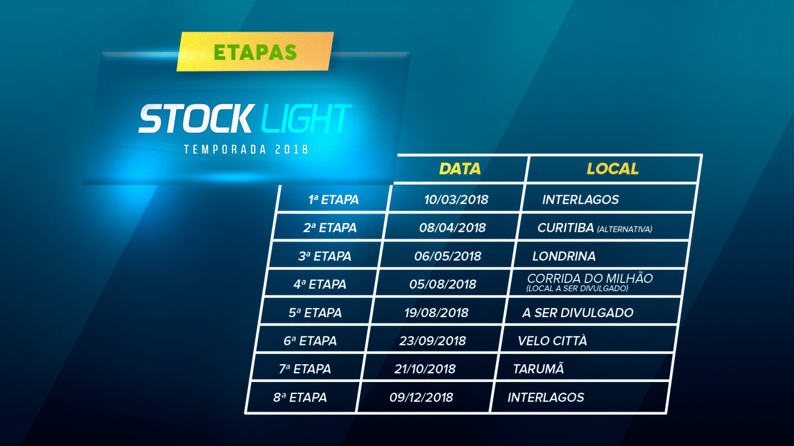 O calendário da temporada 2018 terá oito etapas, sendo sete rodadas duplas e a final em corrida única com pontuação dobrada. Todas as provas terão o botão de ultrapassagem conhecido como push to pass, pit stop para reabastecimento obrigatório e a inversão do grid na segunda corrida das rodadas duplas.