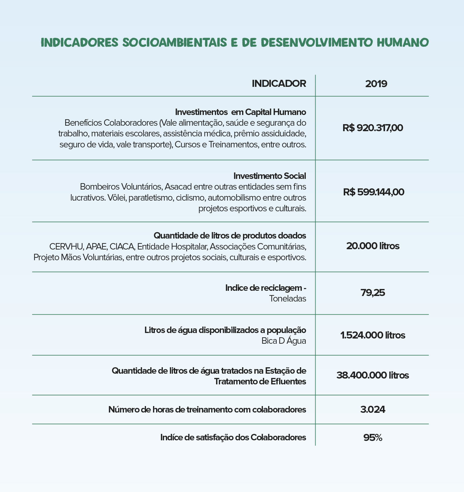 Acreditamos que a construção de um mundo melhor se faz por meio de laços e ações comunitárias. É por isso que investimos em projetos sociais, culturais e esportivos. Por entender a responsabilidade que cabe a nós enquanto indústria e a importância de ajudar na preservação da natureza, mantivemos acordos de destinação de resíduos sólidos recicláveis e durante esse ano foram destinados aproximadamente 80 toneladas junto a diversas empresas licenciadas pelo IMA (Instituto do Meio Ambiente de Santa Catarina). Além disso, instalamos uma moderna Estação de Tratamento de Efluentes que neste ano tratou 38 milhões e 400 mil litros de água possíveis de reutilização em limpeza da fábrica, calçadas e irrigação do jardim. Nos orgulhamos em ter fornecido gratuitamente para a população mais de 1 milhão de litros de água cristalina.