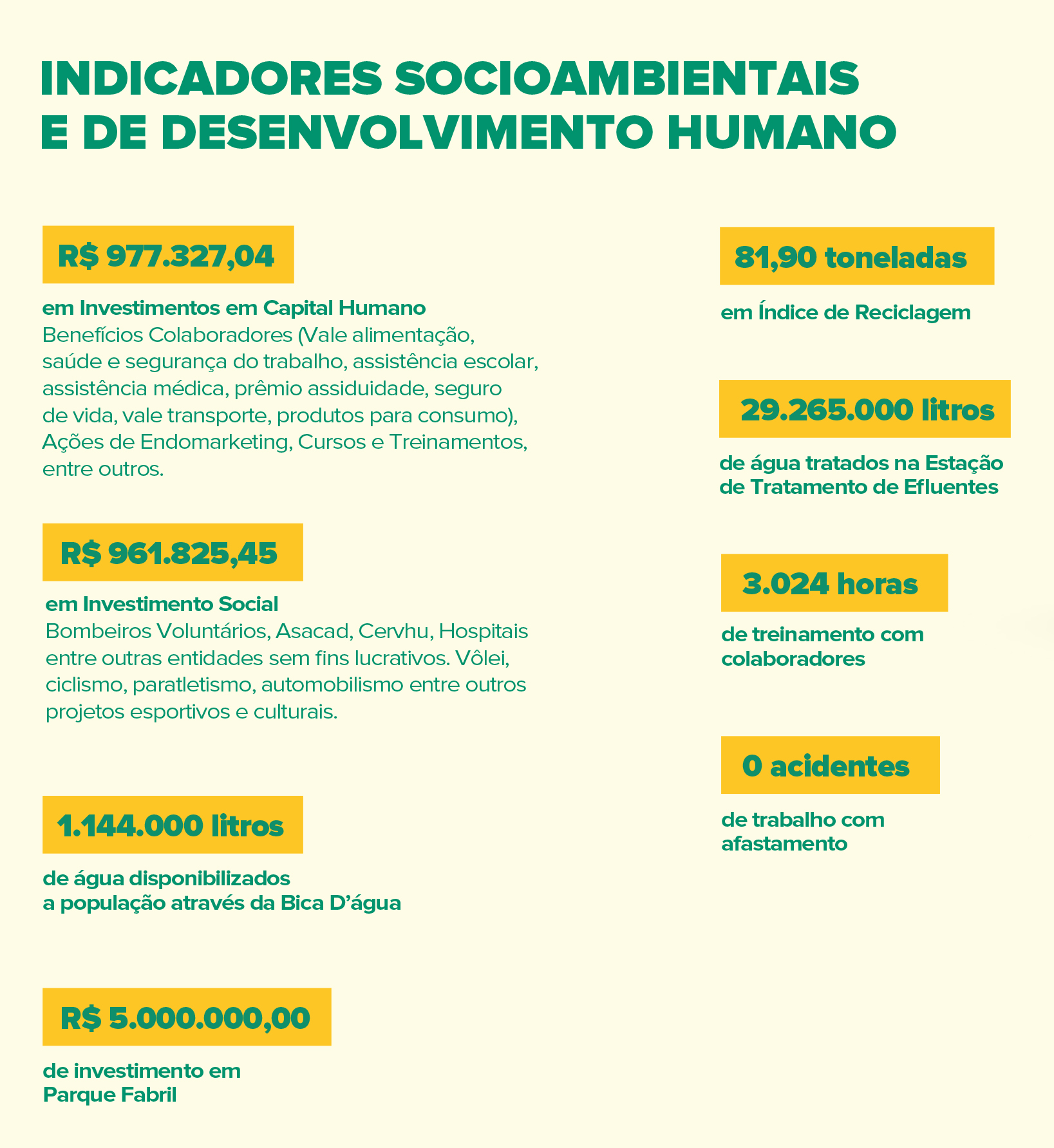 Nos orgulhamos do fornecimento gratuito de 1.144.000 litros de água pura para a população de Braço do Norte e região. A água extraída de um poço artesiano é filtrada e é a mesma utilizada em nossos produtos.